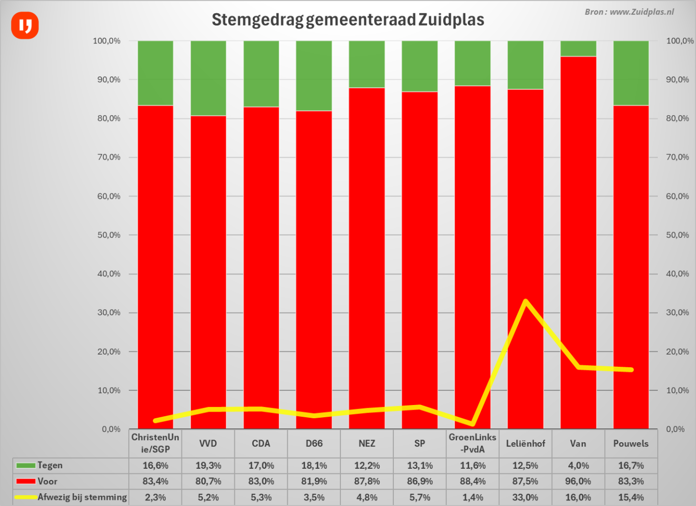 Bij de stemmingen is ook hier de afwezigheid van raadsleden terug te zien, Leliënhof was bij 33% van de stemmingen niet aanwezig en ook de andere afsplitsers Van en Pouwels scoorden net als Beuving (VVD) meer dan 10% afwezigheid bij de stemmingen. Dit zijn stemmingen waarbij het raadslid niet werd vervangen.