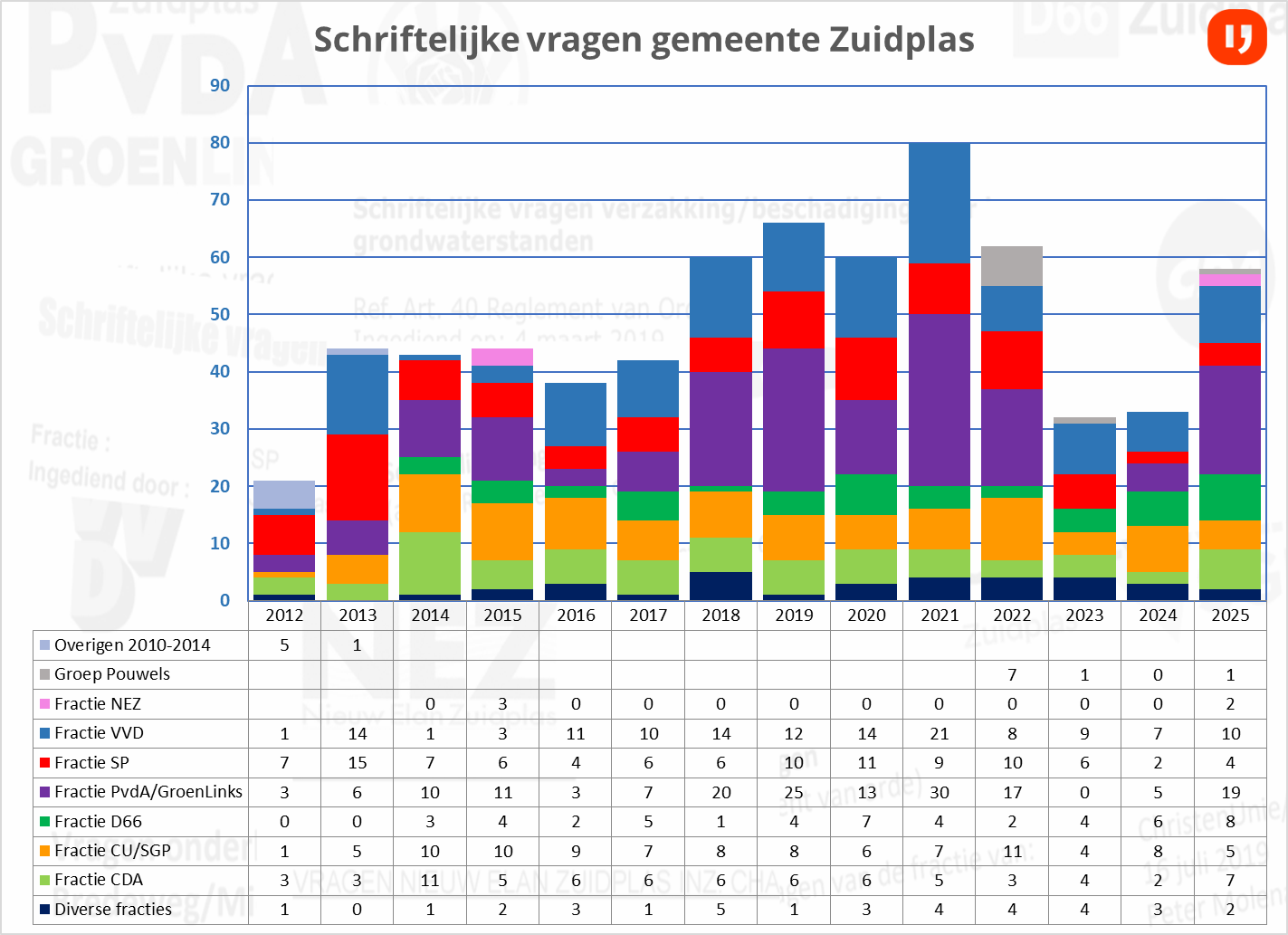 De gemeenteraadsleden mogen het college bevragen over onderwerpen. Opvallend was dat er vaker naar mondelinge vragen werd gegrepen als middel voorafgaand een raadsvergadering. Het aantal schriftelijke vragen van de afgelopen periode is minder dan de perioden hiervoor. Deze vragen moeten binnen 30 werkdagen worden beantwoord maar diverse malen mocht de wethouder met excuses en een uitstelbrief komen dan voorheen. De VVD en GroenLinks-PvdA hebben de meeste vragen gesteld. Van de eenmansfracties stelde alleen raadslid Pouwels enkele vragen. Van de andere partijen viel op dat NEZ slechts tweemaal vragen heeft gesteld.
