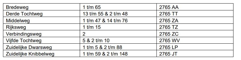 Voor de bewoners van de Middelweg, Bredeweg, Knibbelweg Derde Tochtweg, Rijksweg, Zuidelijke Dwarsweg en Vijfde Tochtweg worden bij de meeste adressen de huisnummers aangepast. De Knibbelweg krijgt in het gebied van Cortelande de naam Zuidelijke Knibbelweg om hulpdiensten niet in de war te maken. De complete lijst met omnummering staat hier en hieronder staan ook de adressen met de nieuwe postcodes. De woonplaats heeft zelfs al een nieuwe CBS code gekregen.