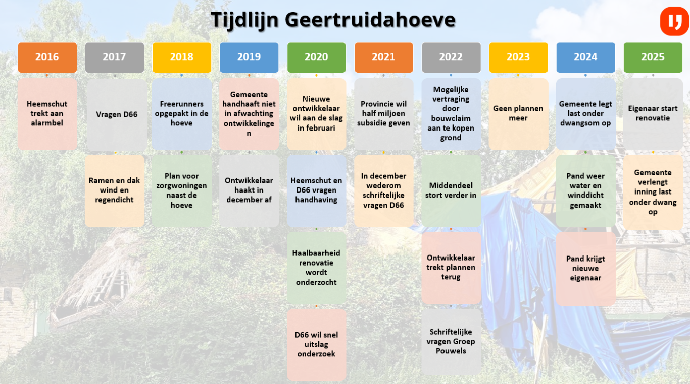 Tijdens het persgesprek van het college van B&W en de lokale pers vertelde wethouder Klovert dat de Geertruidahoeve aan de Eerste Tochtweg een nieuwe eigenaar heeft en daarom de handhaving via een last onder dwangsom verlengd. Nasporing in het Kadaster geeft eind 2024 een verkoop aan van het perceel.