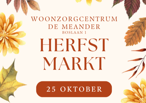 Op zaterdag 25 oktober worden er door de vrienden van de Meander aan de Boslaan 1 in Nieuwerkerk aan den IJssel een herfstmarkt georganiseerd. Deze herfstmarkt zal van 10:00 uur tot aan 16:00 uur zijn in het woonzorgcentrum.