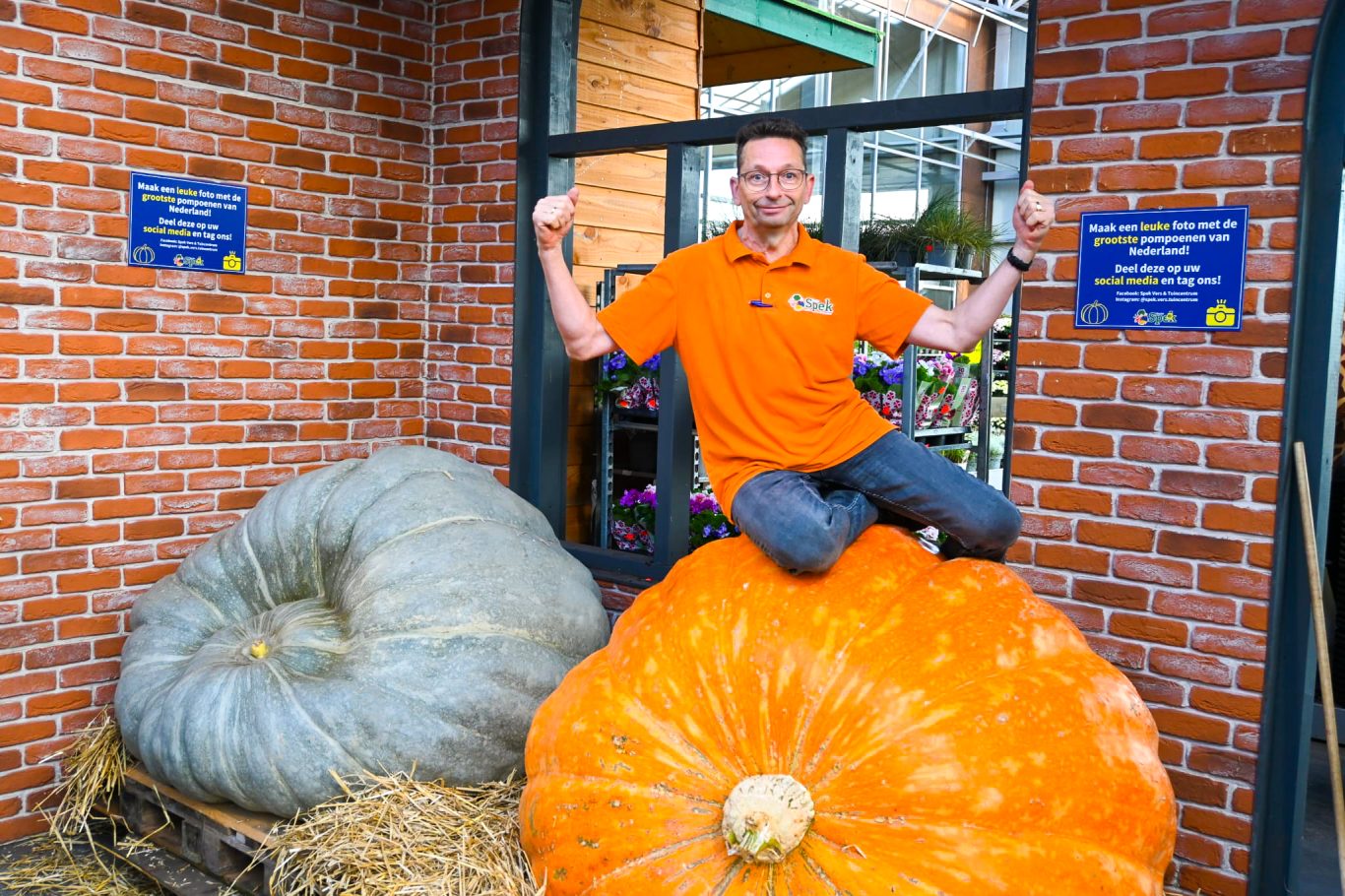De gigantische pompoenen waren eerder te zien bij andere tuincentra, waar bezoekers het gewicht konden raden. Nu liggen ze in Zevenhuizen en zijn ze vooral bedoeld om mee op de foto te gaan. “Leuk voor kinderen, gezinnen of gewoon voor iedereen die iets bijzonders wil zien,” zegt Arie.