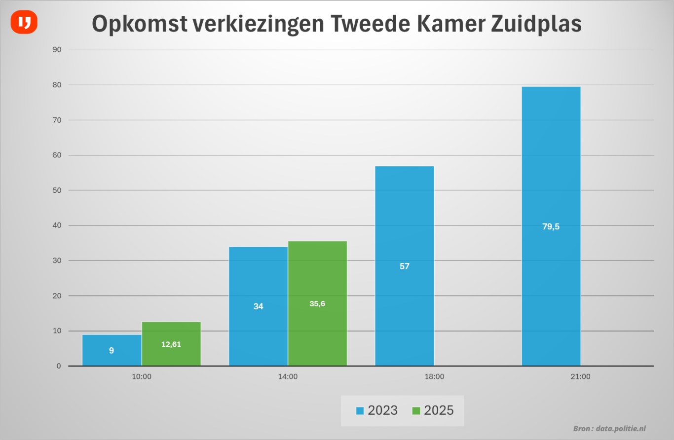 Om 14:00 uur meldde de gemeente Zuidplas dat de opkomst op 35,6% lag, dat is hoger dan bij de Tweede Kamerverkiezingen van 2023 op dat tijdstip, toen had 34% van de kiesgerechtigden haar of zijn stem uitgebracht.