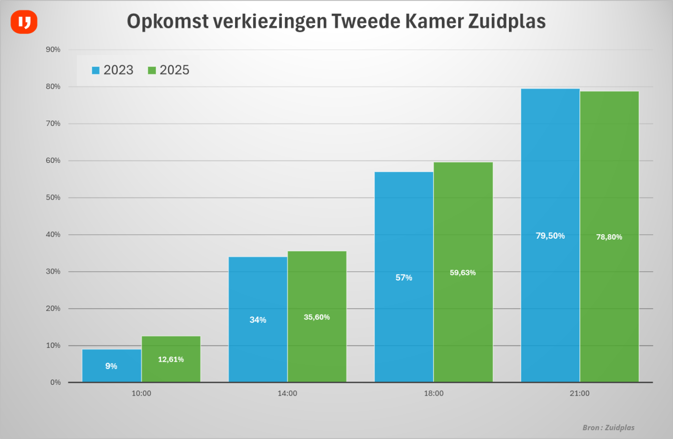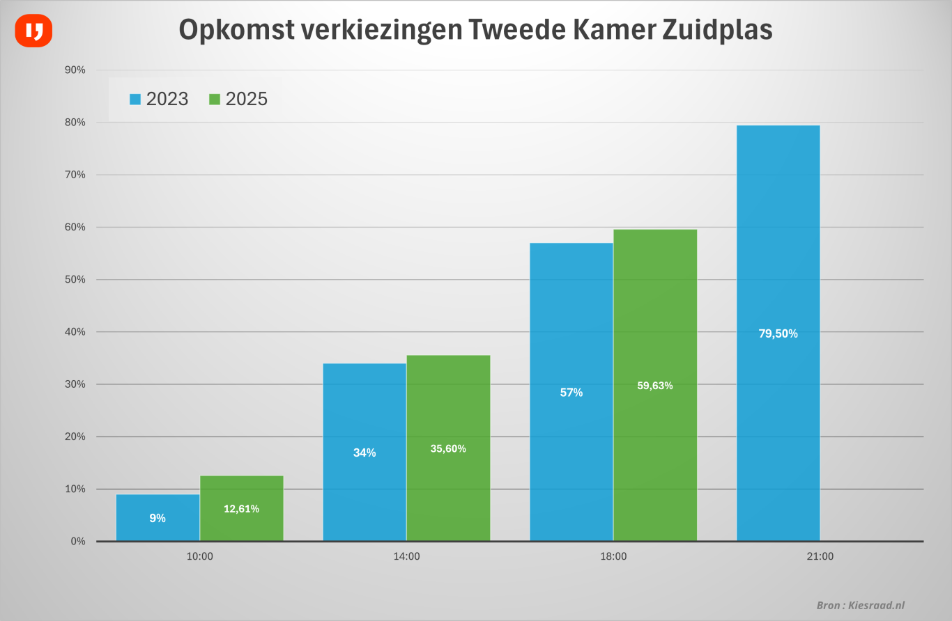 Om 18:00 uur meldde de gemeente Zuidplas dat de opkomst op 59,63% ligt. Dat is wederom hoger dan bij de verkiezingen in 2023. Toen had om 18:00 uur 57% van de kiesgerechtigden zijn of haar stem uitgebracht.