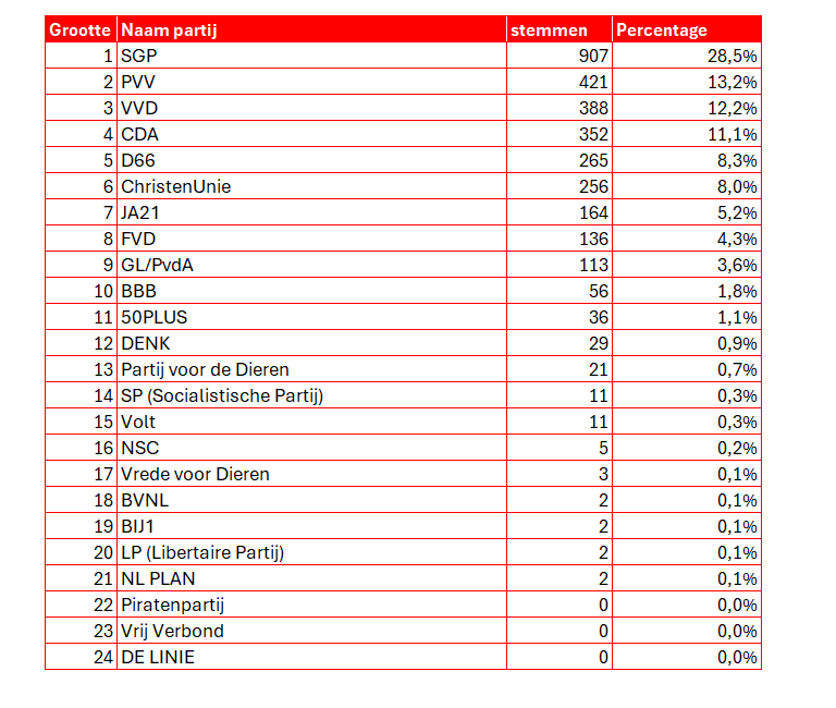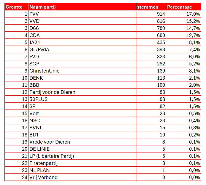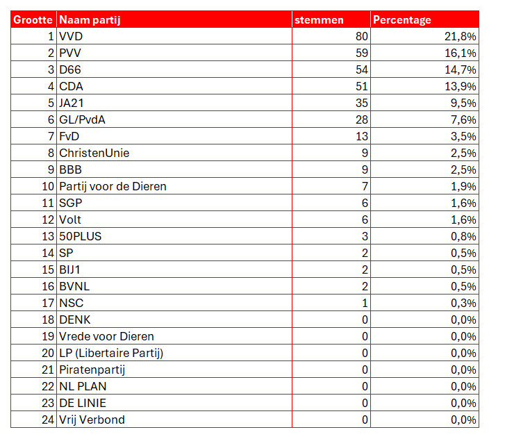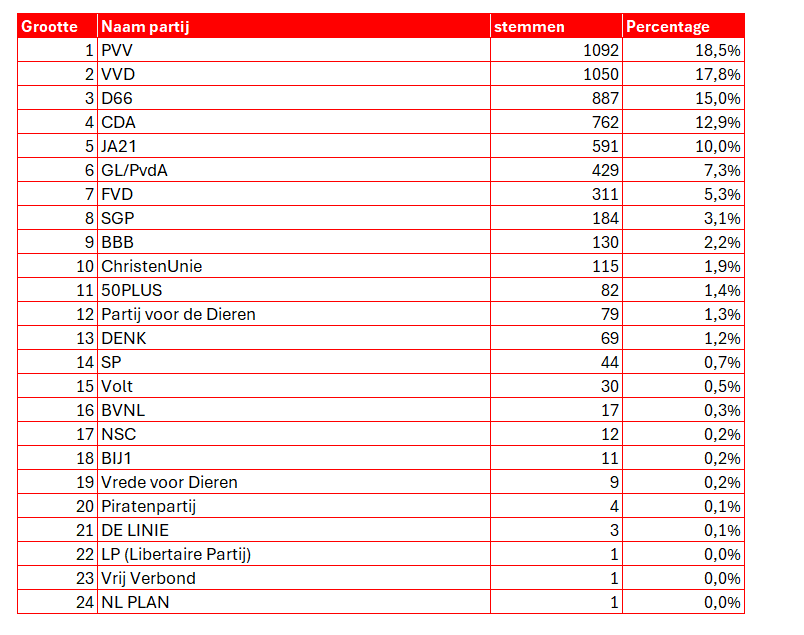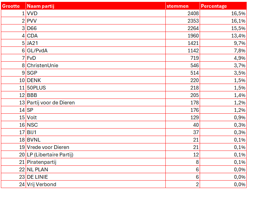Hoe klein het buurtschap dan ook is, er kan altijd gestemd worden al is het alleen in de middag en avond. Dat ondanks het overal bekend was gemaakt mensen het nog niet wisten was terug te lezen in het procesverbaal. De VVD werd de grootste gevolgd op afstand door de PVV, D66 en CDA.