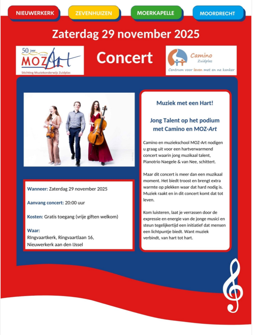 Op zaterdag 29 november klinkt er hartverwarmende muziek in de Ringvaartkerk. Onder de titel ‘Muziek met een hart’ presenteren Camino en Muziekschool MOZ-Art een bijzonder concert waarin jong muzikaal talent centraal staat Tijdens het concert treedt het Pianotrio Naegele & Van Nee op. Een ensemble dat met expressie en energie het publiek weet te raken. Het concert begint om 20:00 uur (inloop vanaf 19:30 uur) en de toegang is gratis.
