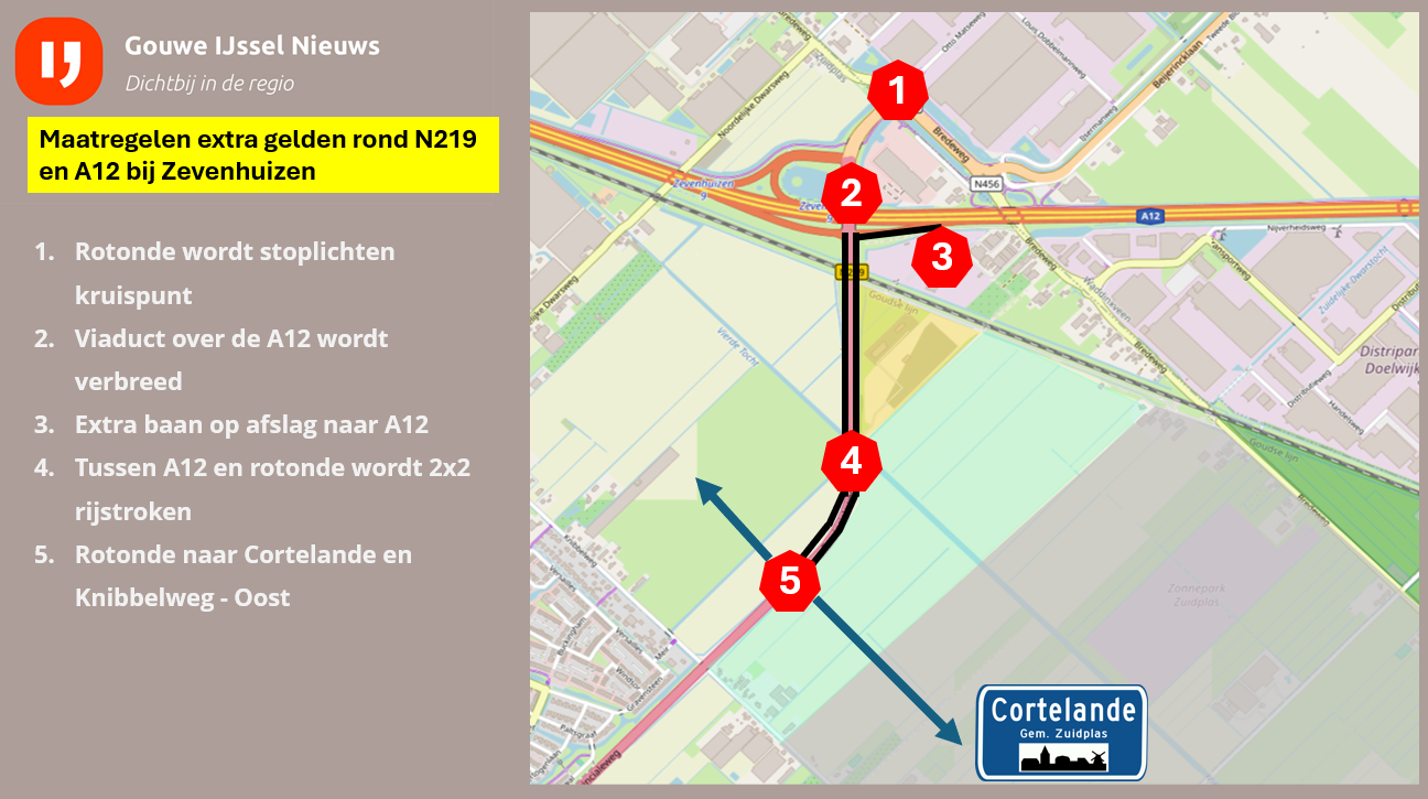 Rond dit gebied wordt vooral aandacht geschonken aan de afwikkeling van het verkeer op de afslag Zevenhuizen/Waddinxveen. Zo wordt het kruispunt van de Bredeweg met de afrit van een rotonde omgebouwd naar een kruispunt met verkeerslichten, wordt het viaduct breder gemaakt en een extra afslag vanaf Waddinxveen naar de A12 richting Gouda. De N219 wordt dubbelbaans tussen de afslag en de Rotonde halverwege. Deze rotonde stond al op de planning, ook om het nieuwe Knibbelweg-Oost te ontsluiten maar ook de toegangsweg aan de westkant van Cortelande. De maatregelen op een rij :
