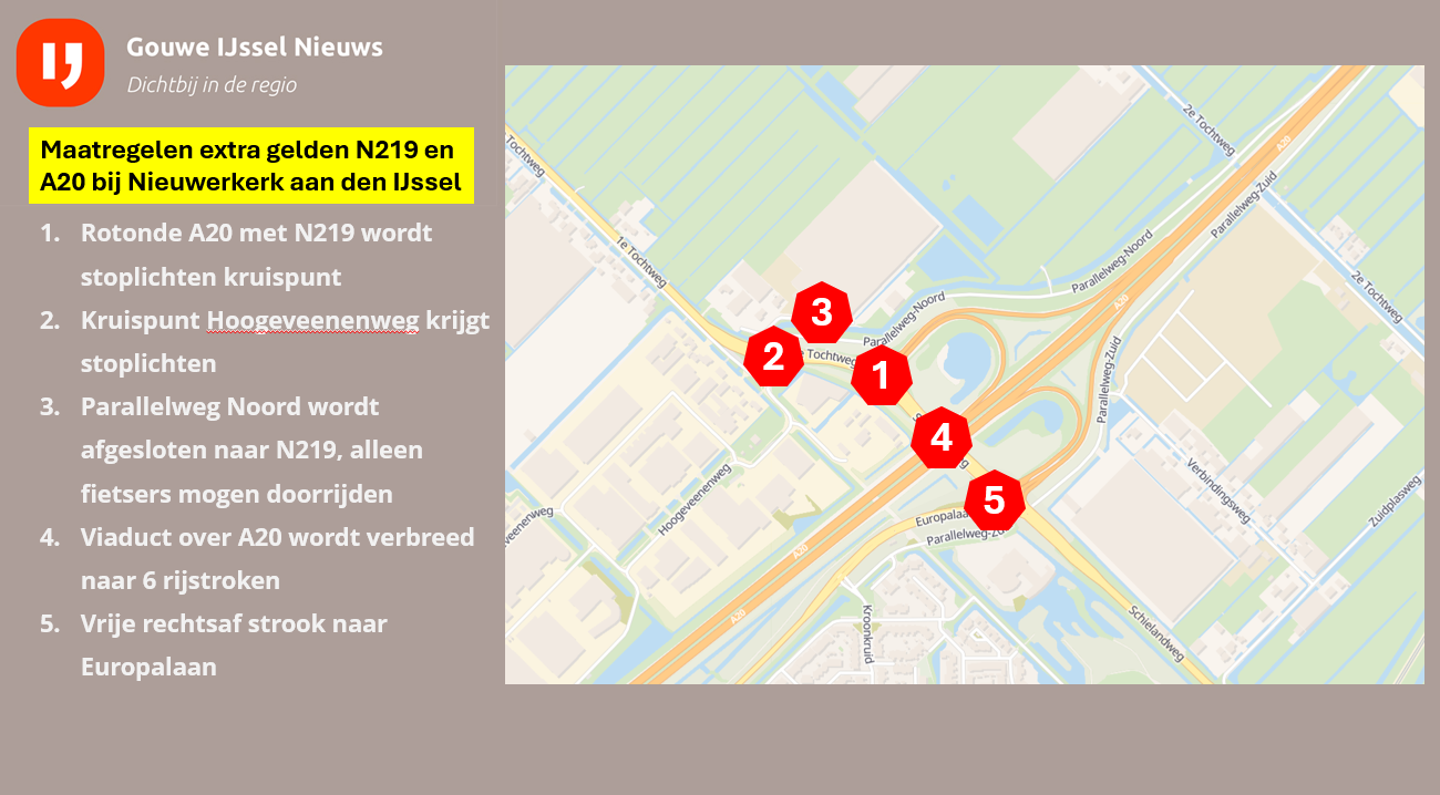 Aan de kant van Nieuwerkerk aan den IJssel gaat de aansluiting van de N219 en de A20 op de schop. De turborotonde met de afrit naar Rotterdam, oprit vanaf Gouda en de N219 wordt omgebouwd naar een kruispunt met verkeerslichten. Datzelfde gaat ook gebeuren voor het kruispunt met de Hoogeveenenweg en de N219, waarbij de Parallelweg-Noord straks wordt afgesloten voor autoverkeer vanaf de N219. Het viaduct over de A20 wordt 2×3 rijstroken en er komt een betere nieuwe strook voor verkeer vanaf dat viaduct naar de Europalaan.