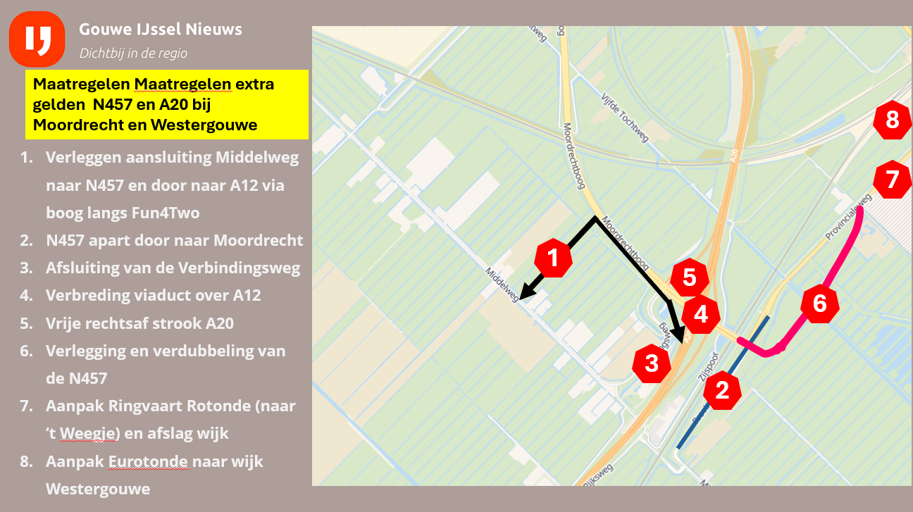 Vanaf de Provincialeweg N457 komt er een rechtdoorstrook naar de Middelweg in Moordrecht. De N457 wordt verlegd meer het land in en krijgt dubbele rijstroken, net als verder op de N207. Zowel de Ringvaartrotonde als de Europarotonde worden aangepast.