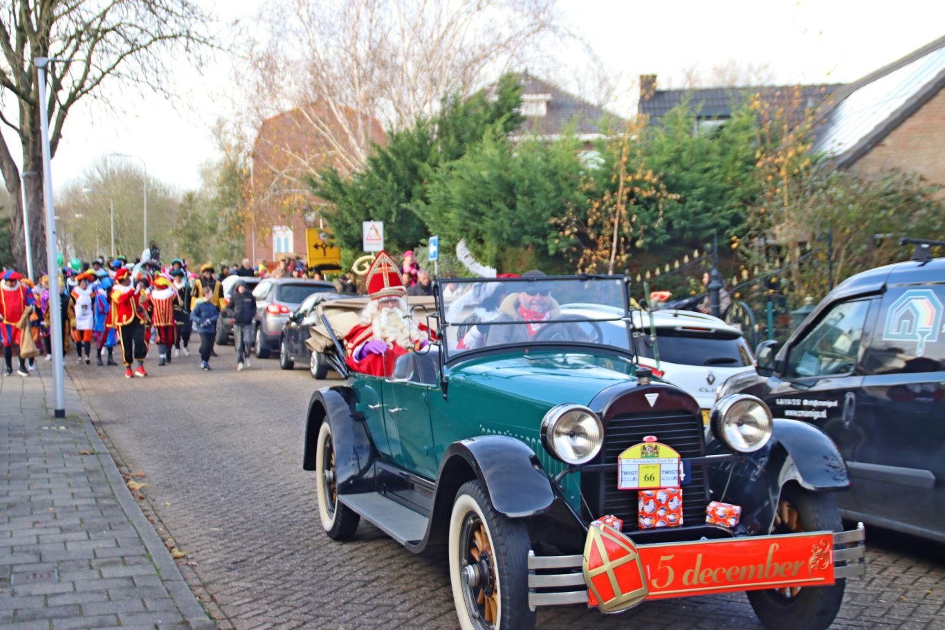 Hierna vertrok hij in een honderd jaar oude auto naar Dorrestein om ook daar alle kinderen gedag te zeggen. Met hulp van de gemeente Zuidplas was de rotonde even opengesteld, waardoor Sinterklaas in de oldtimer naar de Reigerhof gebracht kon worden. Daar wachtten diverse ouders op het fotomoment van hun kinderen met Sinterklaas en de Hoofdpiet. Hier wordt ook jaarlijks de traditionele intochtfoto gemaakt.