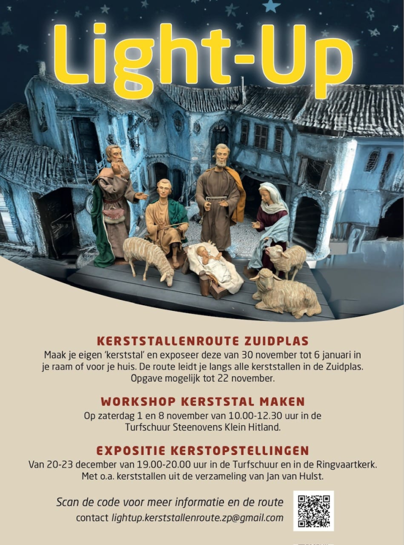 Tijdens de inloopochtend van de Ringvaartkerk vindt op vrijdag 28 november om 11.00 uur de officiële handeling plaats als start van deze Light-Up call. Scan de QR-code van de poster voor achtergrondinformatie in het raam van de Ringvaartkerk. Daar vindt u tevens de link naar de te bezoeken locaties in een google-map. Ook te vinden op facebook de websites van de Ringvaartkerk en Steenovens Klein Hitland /agenda. Contact; lightup.kerststallenroute.zp@gmail.com