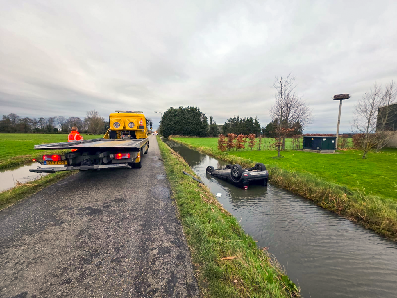 De brandweer heeft nog voor de zekerheid met een duiker een zoekslag gemaakt in de sloot maar heeft niets verder aangetroffen. Een berger heeft zijn handen vol aan het bergen van het voertuig op de smalle polderweg. Een omwonende is met een heftruck de berger te hulp geschoten.