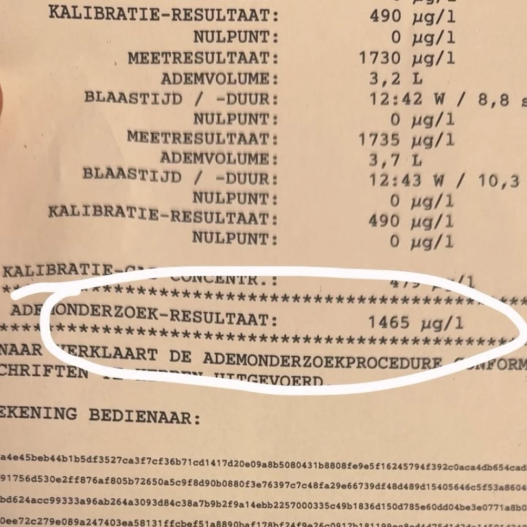 De 30-jarige verdachte zonder vaste woon of verblijfplaats bleek zwaar onder invloed van alcohol en blies 1465 µg/L Dit staat voor 1,68 promille alcohol terwijl de max 220 µg/L (0,5) promile de grens op waarop een bestuurder mag rijden. Dit staat ongeveer tussen de 12 en 15 standaardglazen alcohol.