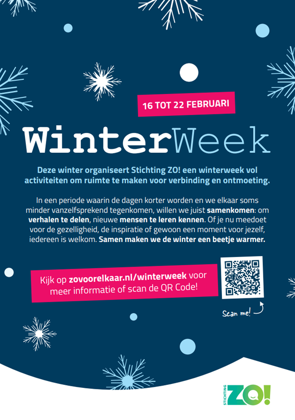Voor informatie over het hele programma en om je in te schrijven voor de verschillende activiteiten ga je naar zovoorelkaar.nl/winterweek. Inschrijven kan van 19 januari 09.00 uur tot en met 1 februari maar wees er snel bij want voor sommige activiteiten zijn er maar enkele plekken vrij.