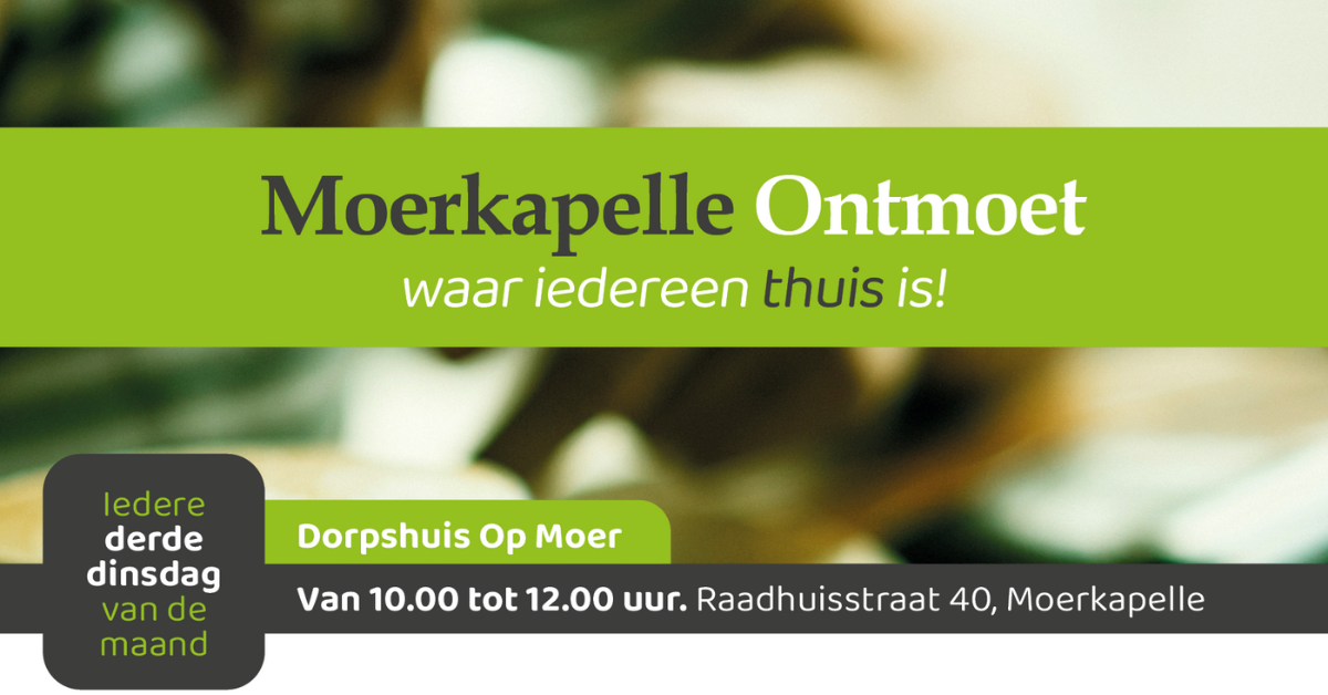 Moerkapelle Ontmoet is er elke derde dinsdag van de maand van 10.00 tot 12.00 uur in Dorpshuis Op Moer, aan de Raadhuisstraat 40 in Moerkapelle. Deze inloop is gratis en iedereen is welkom voor een kop koffie, een praatje en een leuke activiteit. Elke maand is er een ander thema. Dat kan creatief zijn (samen iets maken), actief (samen bewegen) of gewoon een andere gezellige bezigheid. Zo is er elke maand weer iets nieuws en voor iedereen iets leuks te doen. Deelname aan de activiteiten is niet verplicht.
