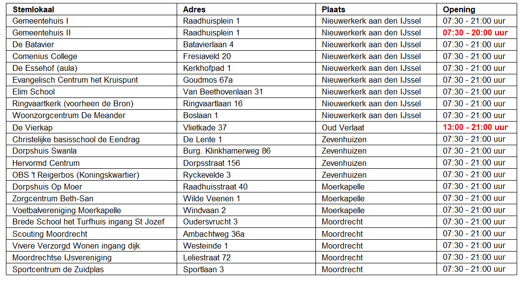 Bij besluit van burgemeester Weber zijn de onderstaande stembureaus ingesteld. Alle stembureaus zijn open van 07:30 uur tot 21:00 uur tenzij anders aangegeven. Op het interactieve kaartje kunt u de exacte locatie vinden.