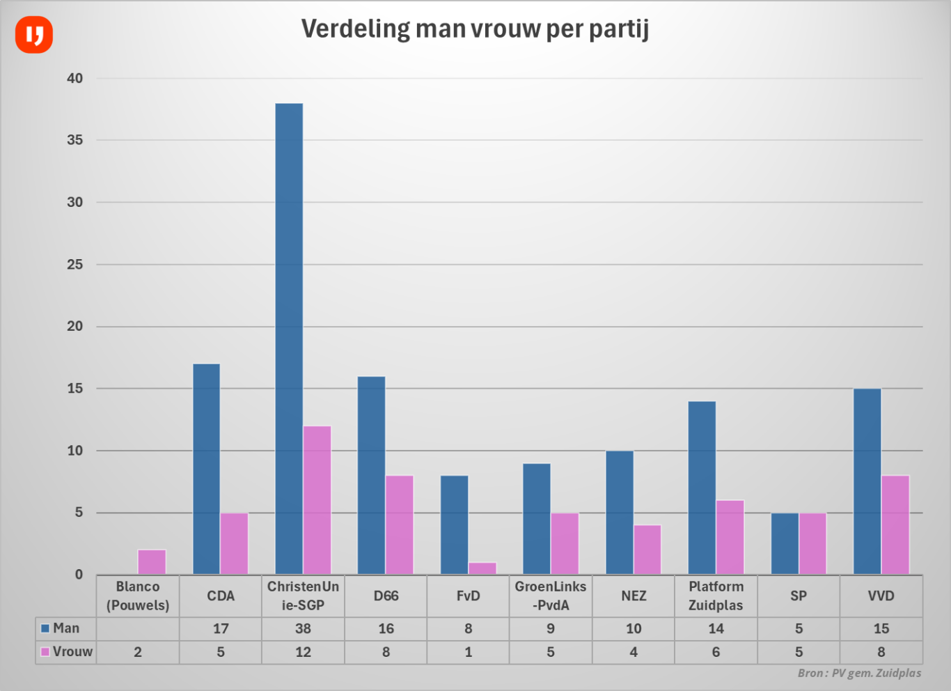 Van de 188 kandidaten voor de gemeenteraadsverkiezingen in de gemeente Zuidplas blijkt minder dan 30% van de kandidaten een vrouw te zijn. Vier van de 10 deelnemende partijen kennen een vrouwelijke lijsttrekker. Percentueel zijn de meeste vrouwen bij de blanco lijst van Pouwels : 2 van de 2 kandidaten (100%), Forum voor Democratie heeft van de 9 kandidaten slechts 1 vrouw (11,1%).