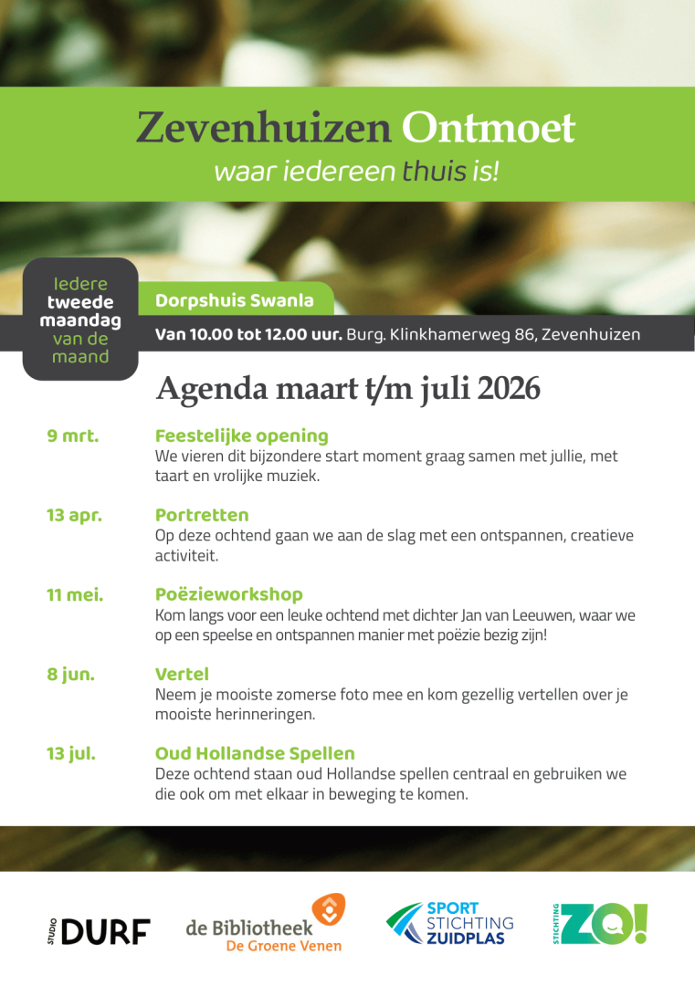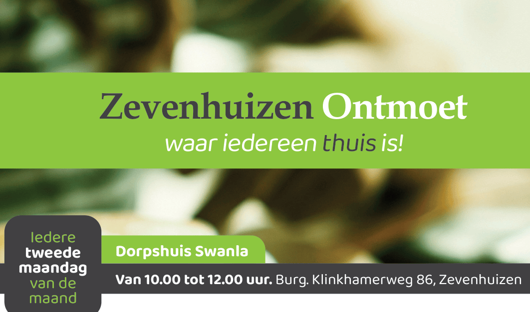 Zevenhuizen Ontmoet is een maandelijkse inloopochtend voor alle inwoners van Zuidplas. Het is een gezellige plek om mensen te ontmoeten, samen iets te doen of gewoon even een kopje koffie te drinken. De officiële opening is op maandag 9 maart om 10.00 uur bij dorpshuis Swanla. Iedereen is welkom om de opening mee te vieren.