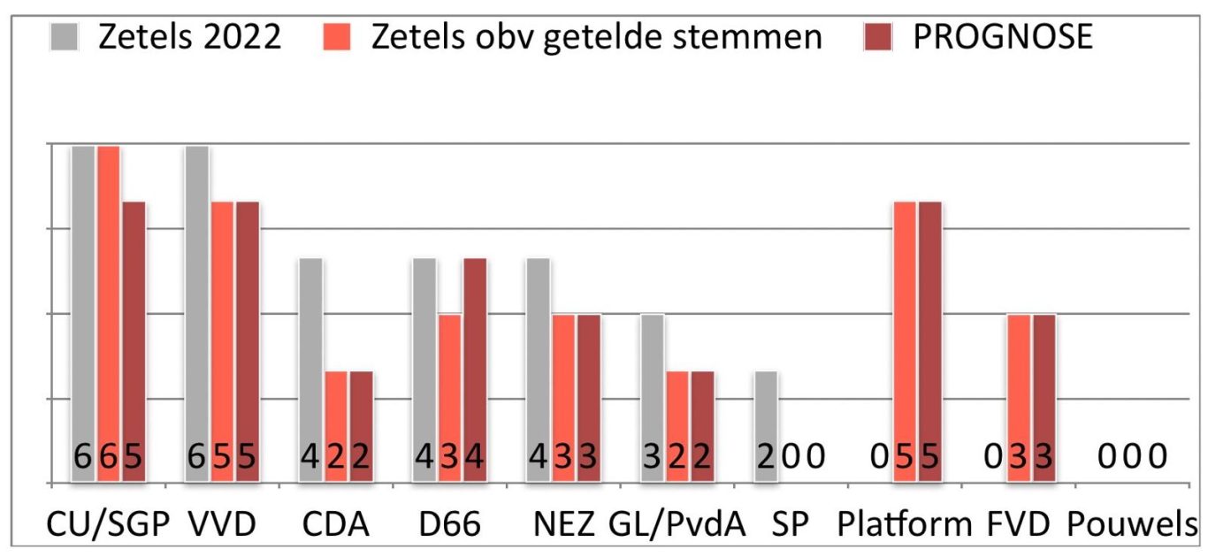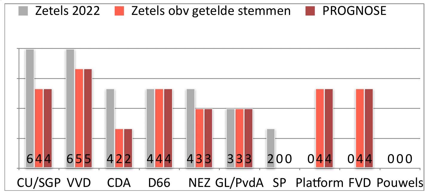 Deze prognose is op basis van 40 procent van de stemmen. Verschil met vorige prognose ontstaat doordat er meer Moerkapelse stemmen geteld zijn.