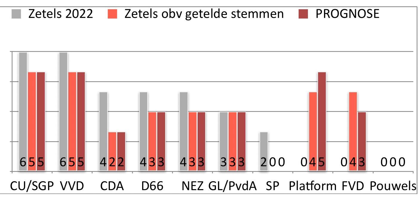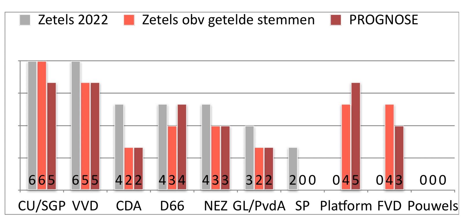 Na het tellen van alle stemmen blijkt Platform Zuidplas met vijf zetels de grootste winnaar te zijn. FVD, ook een nieuwkomer, krijgt vier zetels. De zetels komen van CU-SGP die er nu vijf krijgt in plaats van de zes de vorige keer. Ook de VVD levert een zetel in en komt op vijf zetels. CDA verliest de helft en heeft nog maar twee zetels over. D66 raakt ook een zetel kwijt en komt op 3 net zoals NEZ. GL/PvdA levert ook een zetel in en moet het met twee zetels doen. De SP komt niet meer terug in de raad en ook Sep Pouwels moet haar zetel opgeven. Wel een kleine disclaimer. Op donderdag worden alle stemmen nog een keer geteld en vrijdag wordt de uitslag definitief gemaakt.