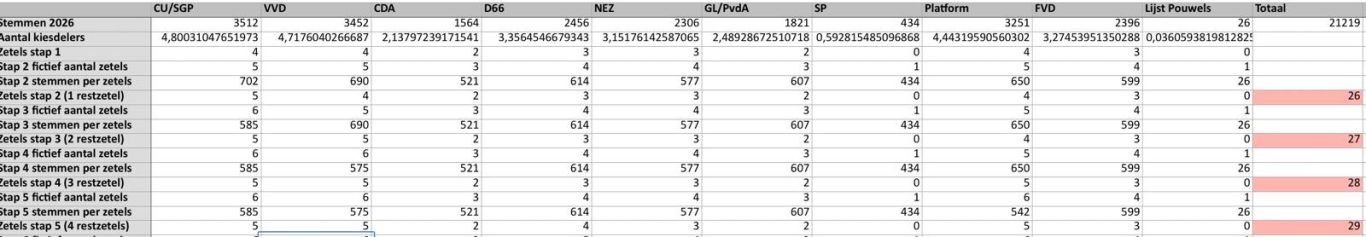 De laatste zetels worden met een ingewikkelde formule verdeeld. Dit worden de restzetels genoemd. Met de huidige prognose van Gouwe IJssel Nieuws haalt D66 nog net een zetel. Het gaat om een verschil van 30 stemmen. De eerste die er in plaats van D66 kans op maakt is Groen Links /PvdA, maar ook FVD maakt kans op die extra zetel. Onderstaand een screenshot van de excelsheet die we gebruiken.