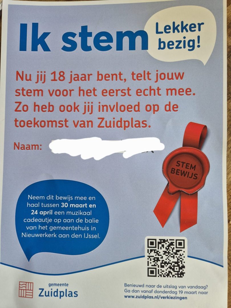 In Nederland ligt de grens voor kiesrecht op precies 18 jaar. Gevolg is dat sommige jongeren net wel en andere nog net niet mogen stemmen. Maar als een 18-jarige, en dus nieuwe kiezer, zich meldt op het stembureau zorgt dat voor vreugde bij de stembureauleden. De jonge kiezers worden speciaal welkom geheten en krijgen een “stembewijs” in de vorm van een soort “stemdiploma” mee naar huis. Het gaat om een papier met bedankje en de mededeling om in april een muzikaal cadeautje op te halen in het gemeentehuis. Het is natuurlijk ook mogelijk om het papier te bewaren samen met het ooit behaalde veterdiploma.