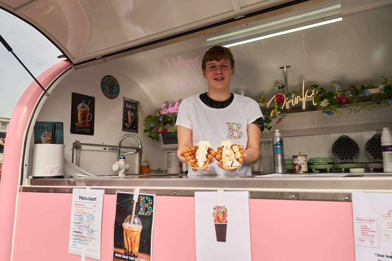 Hippe wafels en ijskoffie konden gekocht worden bij Bobaboyz waar Thomas en Lex, die al vanaf 13 jarige leeftijd begonnen zijn met de verkoop van al het lekkers in deze gekleurde foodcar.